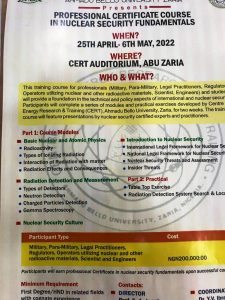 The nuclear security workshop in Nigeria formerly planned for 25 April to 6 May, 2022 held on 23 May to 3 June, 2022.